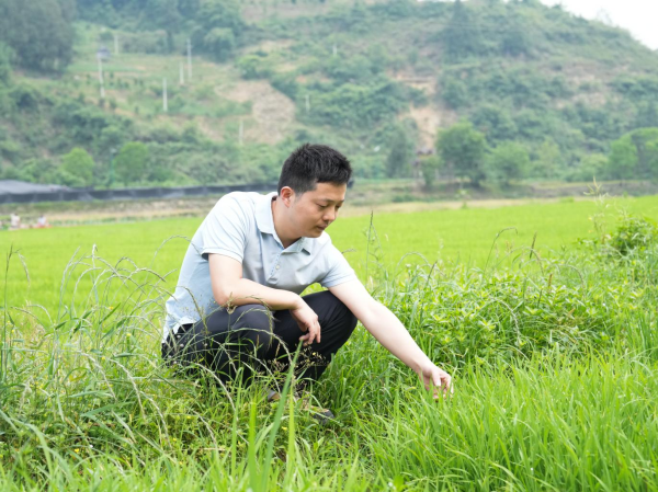 杨祖滔查看秧苗生长情况