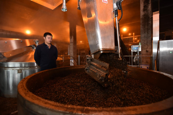 第三“变”:酒糟“变”基酒。通过采取“传统+创新”的生产工艺,应用机器人上甑、自动摘酒、自动化传输、槽式发酵、冷凝水回收利用等创新生产方式,酿造酱香基酒。