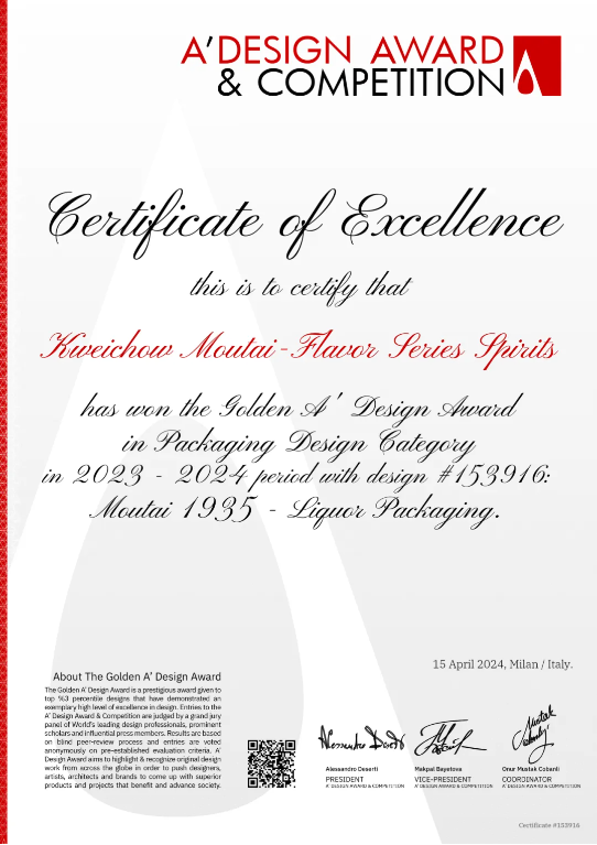 近日,全球规模最大、分布最广的国际设计奖项之——意大利A'设计大奖赛A'Design Award & Competition(designaward.com)公布了2023—2024年设计竞赛的结果,获奖者来自114个国家、151个不同设计学科。茅台1935酒凭借卓越的设计和品质,再次在国际舞台上脱颖而出,荣获A'Design Award金奖。这一殊荣彰显了其卓越的设计实力,并获得了国际设计行业及专家团队的高度认可和广泛赞誉。