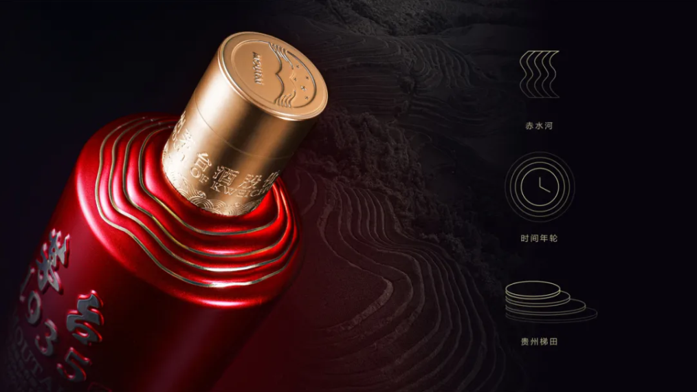 瓶肩 是传承与创新最显著的特征之一瓶肩打破了传统的茅型瓶的台阶式设计,四圈渐缩式的金色纹饰,既是对茅台酿酒水源一一赤水河的致敬;也是茅台起源之地一一贵州最具特色的梯田的具象化体现,象征着劳动和收获。此外,纹理的俯视效果形如年轮,传达出茅台历经时光雕刻的文化底蕴,赋予了包装浓厚的历史气息。