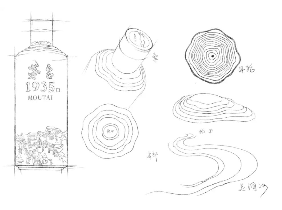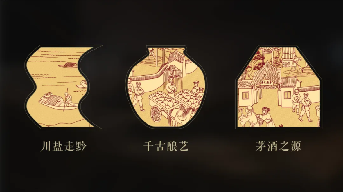 插画 是产品文化内涵的艺术表现瓶身上通过原创手绘的形式,将赤水河畔(茅台酒的酿酒水源)、川盐入黔(贵州的盐运史)、千古酿酒工艺生动形象地描绘出来。将茅台悠久的历史直观地传达给全世界,并向世界展示中国的酒文化。
