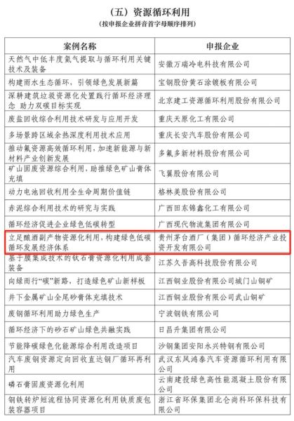 贵州茅台酒厂(集团)循环经济产业投资开发有限公司“立足酿酒副产物资源化利用,构建绿色低碳循环发展经济体系”入选“资源循环利用”类优秀案例。