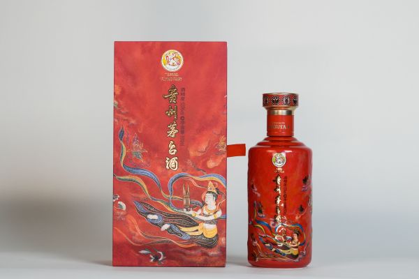 贵州茅台酒(笙乐飞天)在设计灵感上,以敦煌莫高窟壁画中飞天仙女的曼妙形象为核心进行创作,用“紫矿”为主色调,通过手绘的艺术手法,细腻勾勒出仙女轻灵的体态与优雅的舞姿,将其优雅华贵及空灵飘逸的姿态提炼到了极致,绘画采用铁线描技法,以晕染、工笔重彩、颜色铺排与线条并重,促使壁画风格更真实饱满,达到“人物八面,生气盎然”的艺术效果,呈现出与敦煌壁画一致的矿物质陶瓷手感,让产品文化与敦煌壁画相融相生,极具文化价值和审美艺趣。规格为500ml/瓶。