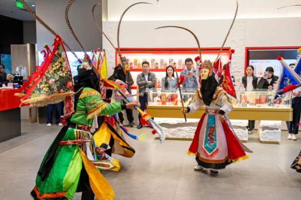 活动特邀安顺地戏传承人周顺老师及其团队到沪表演,将现场氛围推向高潮。演员们头戴精美的木雕面具,身着传统戏服,以高亢的唱腔和刚劲的动作,演绎了三英战吕布的经典桥段,重现往昔风华。地戏不仅是贵州安顺屯堡文化的代表,更是中国非物质文化遗产的瑰宝。通过地戏表演,旨在让更多的人通过茅台了解贵州非遗文化,传承中华传统文化瑰宝。