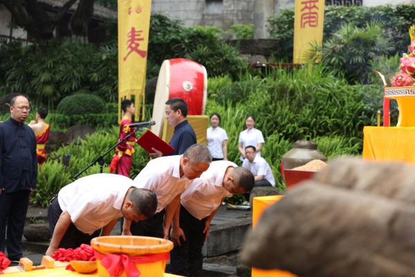 主敬人、制曲八车间主任范成伍向天、地、水敬献美酒,祈求风调雨顺,诸事平安,酒美业宏。并恭读敬麦颂文:匠心独运,弥久弥芳。顺天之道,四序和祥……随后进行取麦、润麦仪式,祈求新一年制曲生产顺利。