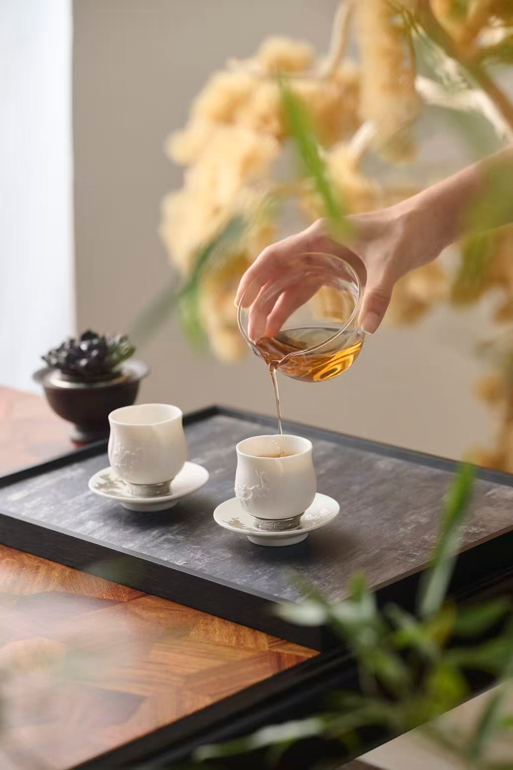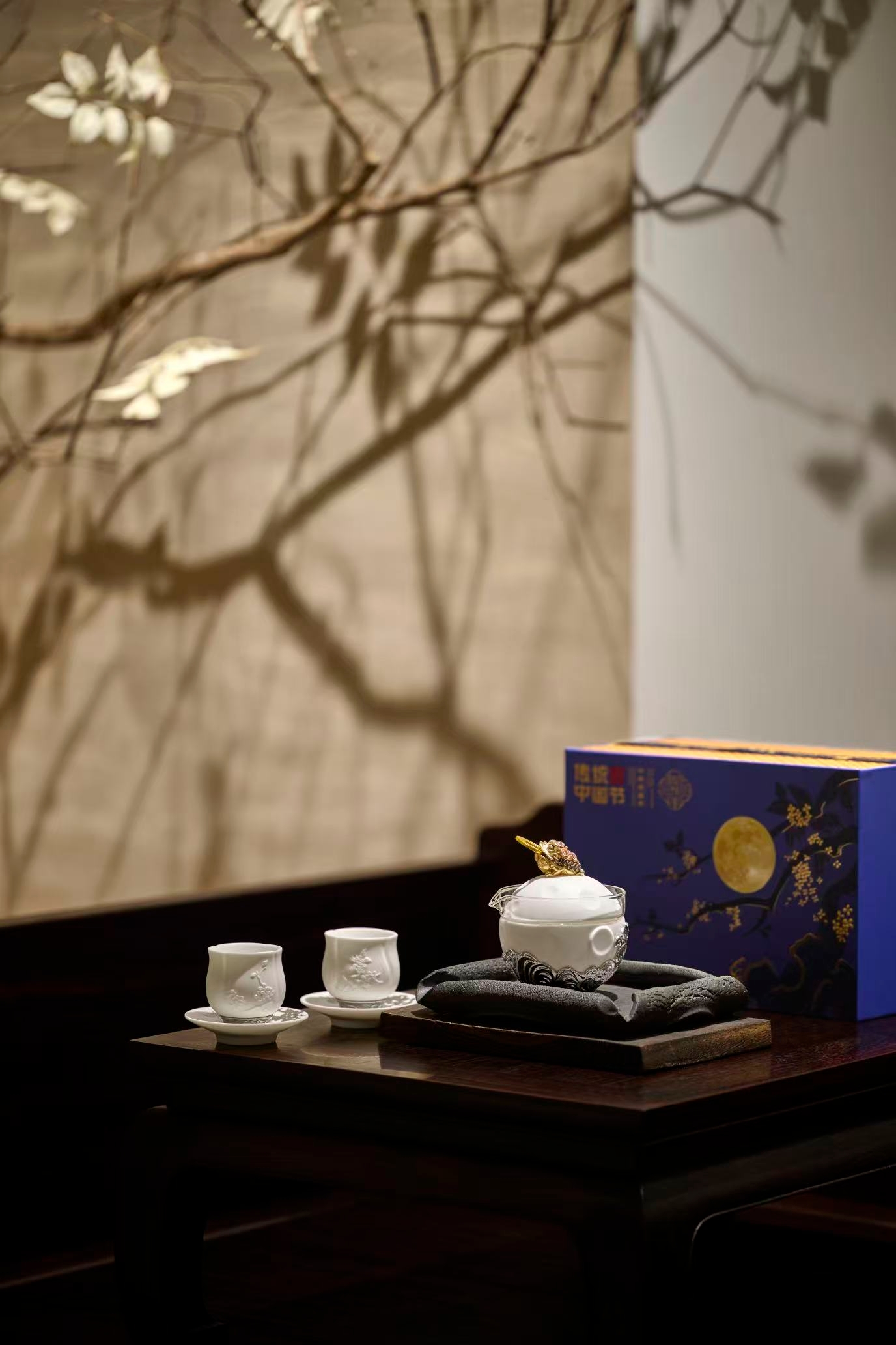 桂花元素的运用更是点睛之笔,四种桂花雕刻于茶杯之上,金桂、银桂、丹桂、四季桂分别承载“大展宏图”“鸿运当头”“吉祥如意”“四季安康”的吉兆,“四桂呈祥”,为中秋佳节送上多重美好祝福。