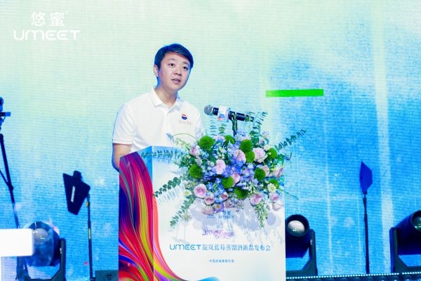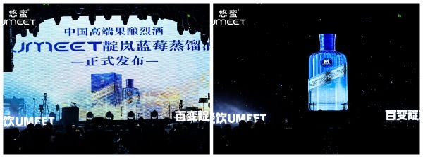 发布会上,张贵超正式宣布UMEET靛岚蓝莓蒸馏酒新品上市。随着激光光束在大屏幕上雕刻出产品图案,新品璀璨亮相,引人瞩目。