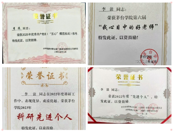 因其突出的科研贡献,李浪先后获评茅台集团先进个人、茅台学院科研先进个人、2025年茅台集团优秀共产党员等多项荣誉。彰显了新时代青年教育工作者求真务实、勇攀科研高峰的精神风貌。