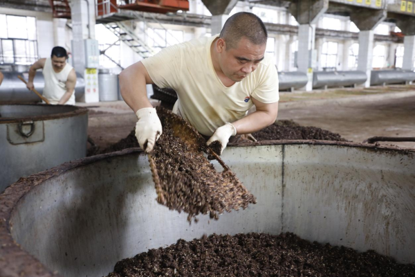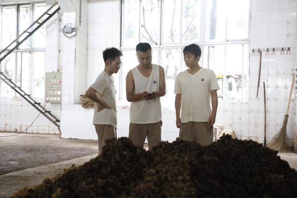 赵冰峰(中)为员工讲解糟醅基质