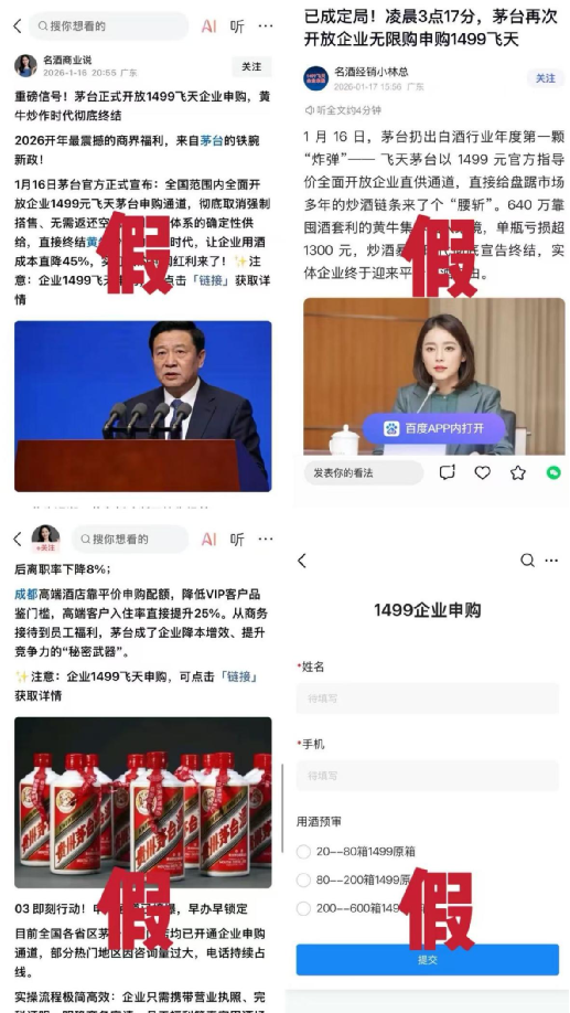 近期,线上平台再次出现冒用茅台名义,发布“开放企业直供通道”“企业1499飞天申购,点击链接获取详情”“飞天茅台官方申请入口”“无需搭售、点击链接立即申请”“1499元企业申购通道”等虚假招商信息,有关内容均属不实宣传,存在误导消费者、甚至诈骗风险。
