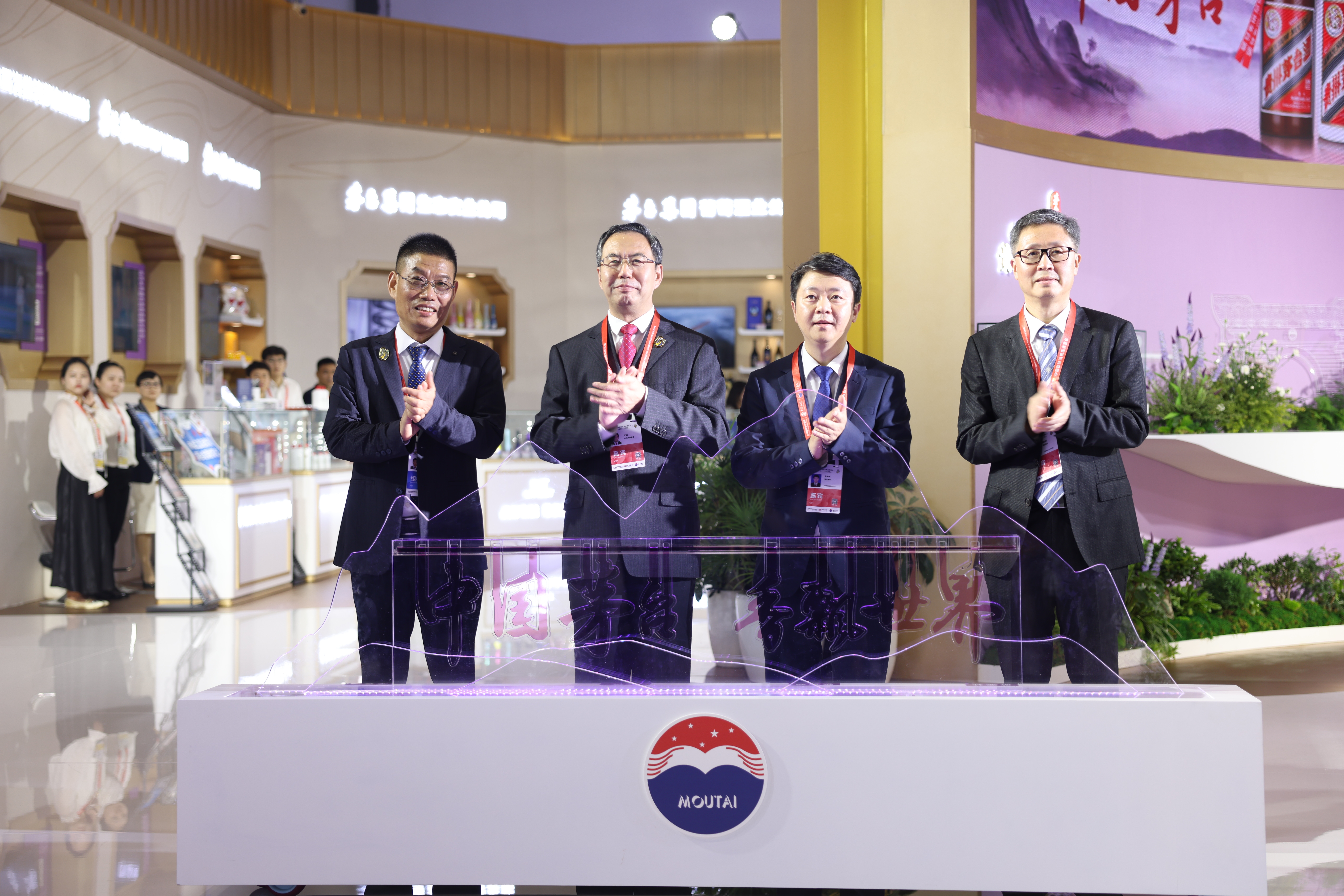 开馆仪式上,领导嘉宾手持盛满齐紫色液体的水壶,将琼浆缓缓注入山水造型装置,随着装置中央“中国茅台 香飘世界”的齐紫色字样渐渐浮现,在灯光璀璨与乐声扬升中,正式开启了茅台在本届消博会的精彩篇章。