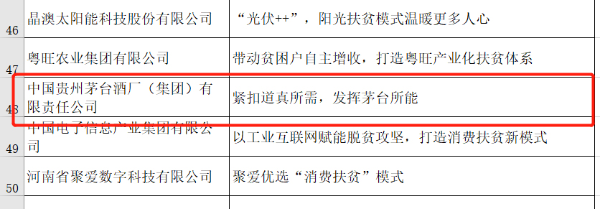 同年11月13日,由国务院扶贫办社会扶贫司指导,中国社会责任百人论坛主办的“中国企业精准扶贫优秀案例(2019)”发布会在京举办,茅台集团以“茅台式精准扶贫:抓牢关键要素,助力乡村振兴”案例入选《中国企业精准扶贫综合案例50佳(2019)》。