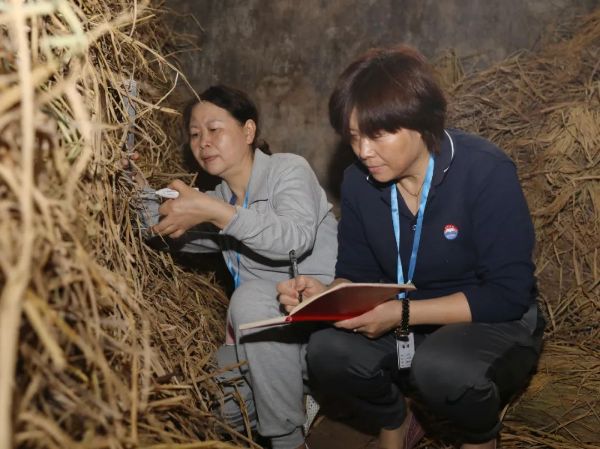 “底草厚度20,垫草厚度6,曲块完好、排列整齐、透气性好……”曲仓里,刘茂琼仔细检测着装仓情况,何传勇专心记录着测量数据。