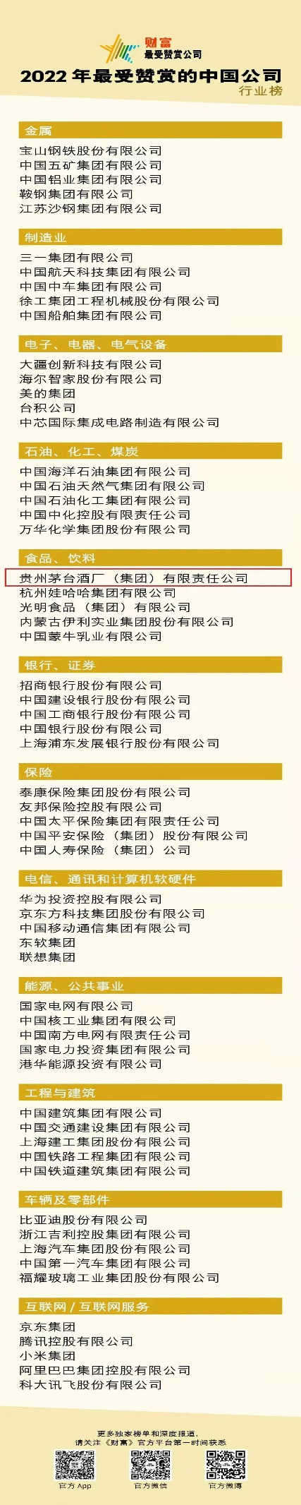 12月27日,《财富》发布2022年最受赞赏的50家中国公司全明星榜,茅台集团榜上有名,并在食品、饮料行业榜名列榜首。