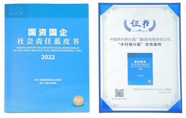 2022年12月20日,由国务院国资委社会责任局指导、责任云研究院开展课题执行的《中央企业社会责任蓝皮书(2022)》《国资国企社会责任蓝皮书(2022)》在京发布。茅台集团入选《国资国企社会责任蓝皮书(2022)》乡村振兴篇优秀案例,并在“地方国有企业社会责任·先锋100指数(2022)”中排名第一。
