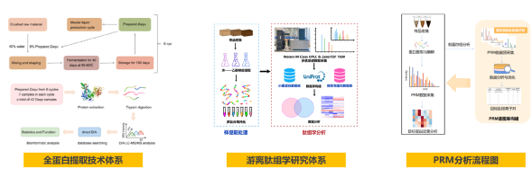 《酱香型白酒高温大曲蛋白质组解析体系构建及应用研究》由茅台集团联合江南大学、复旦大学和中国科学院大连化学物理研究所共同攻关完成。该项目成果在高温大曲蛋白质解析技术体系构建、高温大曲蛋白质时空特性解析,以及关键酶系的调控应用研究方面取得了重大突破。项目从蛋白质这一功能物质角度再次科学证实了茅台酒传统制曲工法的复杂性、独特性、科学性,首次构建了高温大曲蛋白质组解析技术体系,发现了12155种蛋白质,解释了不同轮次基酒多样性与高温大曲功能蛋白之间的相关性,进一步验证了“曲是酒之魂”的科学性,开发了基于PRM技术的大曲中糖苷酶、蛋白酶等关键酶类靶向定量方法,首次创制了基于“时空法”的高温大曲关键酶系调控策略。此外,项目还发现茅台高温大曲中存在919种多肽,并筛选获得了具有抗菌等功能的多肽,拓展了传统白酒酿造过程功能物质及其微生物的资源库。