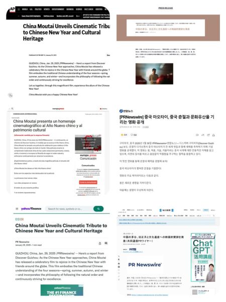 影片推出后,不仅登上美国纽约时代广场大屏幕,更获得美联社、美通社、雅虎财经、欧洲通讯社、朝日新闻、每日新闻等海外主流媒体关注,截至2月12日,全球共有1067家海外媒体通过英语、法语、西班牙语、德语、日语、韩语等6种语言进行报道,共计曝光量约17.37亿次,进一步提升了中国传统文化和茅台品牌的国际影响力。