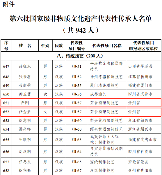 3月17日,国家文化和旅游部公布了第六批国家级非物质文化遗产代表性传承人名单,其中,茅台酒股份公司严刚、任金素入选。加之于2009年入选的季克良,至此,茅台共有三人入选国家级非遗代表性传承人名单。