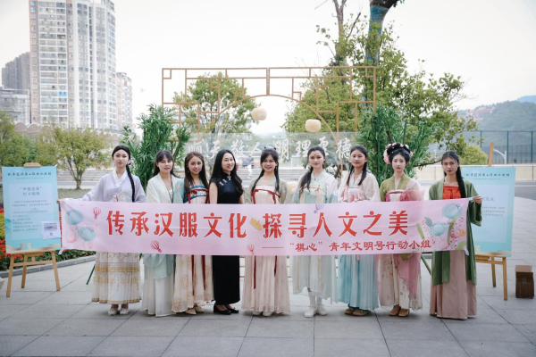 傍晚时分的文体中心外场,晚风徐徐,活动场景设计精心,充分诗情画意。“云上霓裳”篇,参与活动的职工及家属们身着唐装汉服,于中式庭院吟诗打卡,执笔写下“人”字签到,以传统叉手礼领取通关文牒,寓意:做事先做人,做人先学礼,开启沉浸式游园之旅。