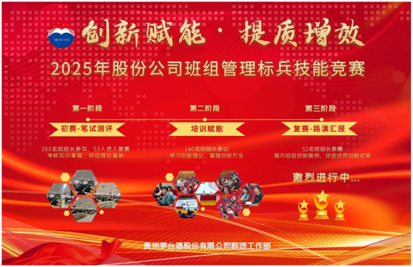 为深入学习贯彻习近平新时代中国特色社会主义思想特别是习近平总书记关于工人阶级和工会工作的重要论述,认真落实党的二十大及中国工会十八大精神,按照茅台酒股份公司《2025年班组管理标兵技能竞赛方案》工作要求,4月28日,2025年茅台酒股份公司班组管理标兵技能竞赛第三阶段——创新路演在茅台会议中心举行,积极引导茅台班组长发挥“兵头将尾”作用,大力弘扬劳模精神、劳动精神、工匠精神,充分展现茅台班组建设成果和职工良好精神风貌,也标志着此次竞赛圆满落幕。